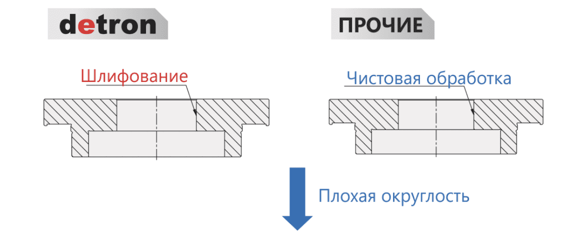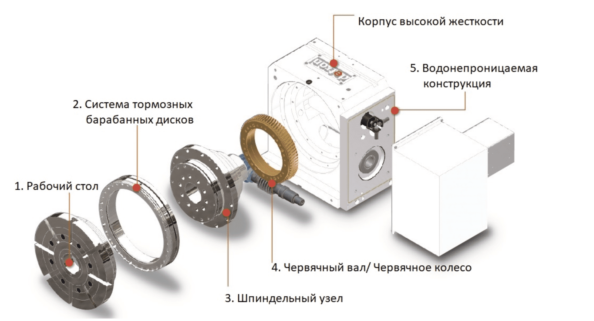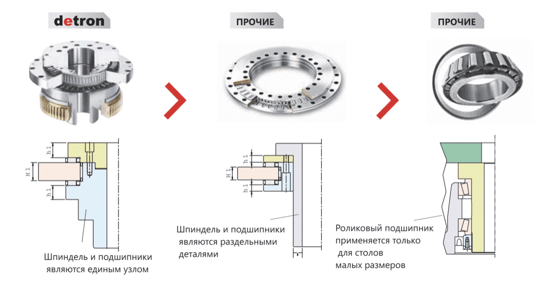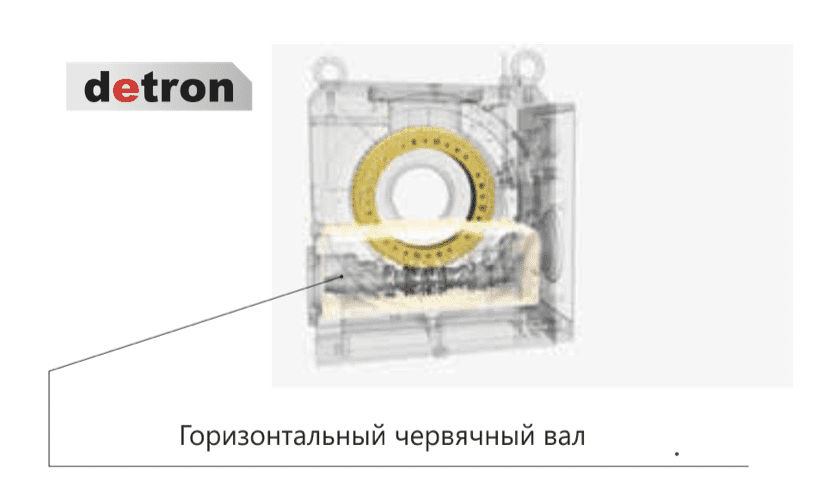● Увеличенная глубина зубьев и двунаправленный червячный винт позволяют работу в тяжелых режимах; ● Червячный вал вращается при помощи высокопрочного запатентованного механизма Detron, который обеспечивает увеличенную концентричность червячного вала и высокую точность позиционирования; ● Червячный вал установлен в нижнюю часть поворотного стола и полностью погружен в масло, что обеспечивает увеличенный срок службы.