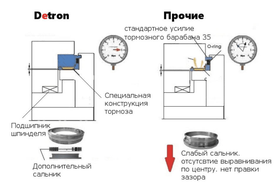 ● Возможность регулировки усилия торможения; ● Высокая концентричность подшипника и тормоза; ● Отсутствуют утечки масла из тормозной системы, что обеспечивает увеличенный крутящий момент при зажиме; ● Легкость обслуживания.